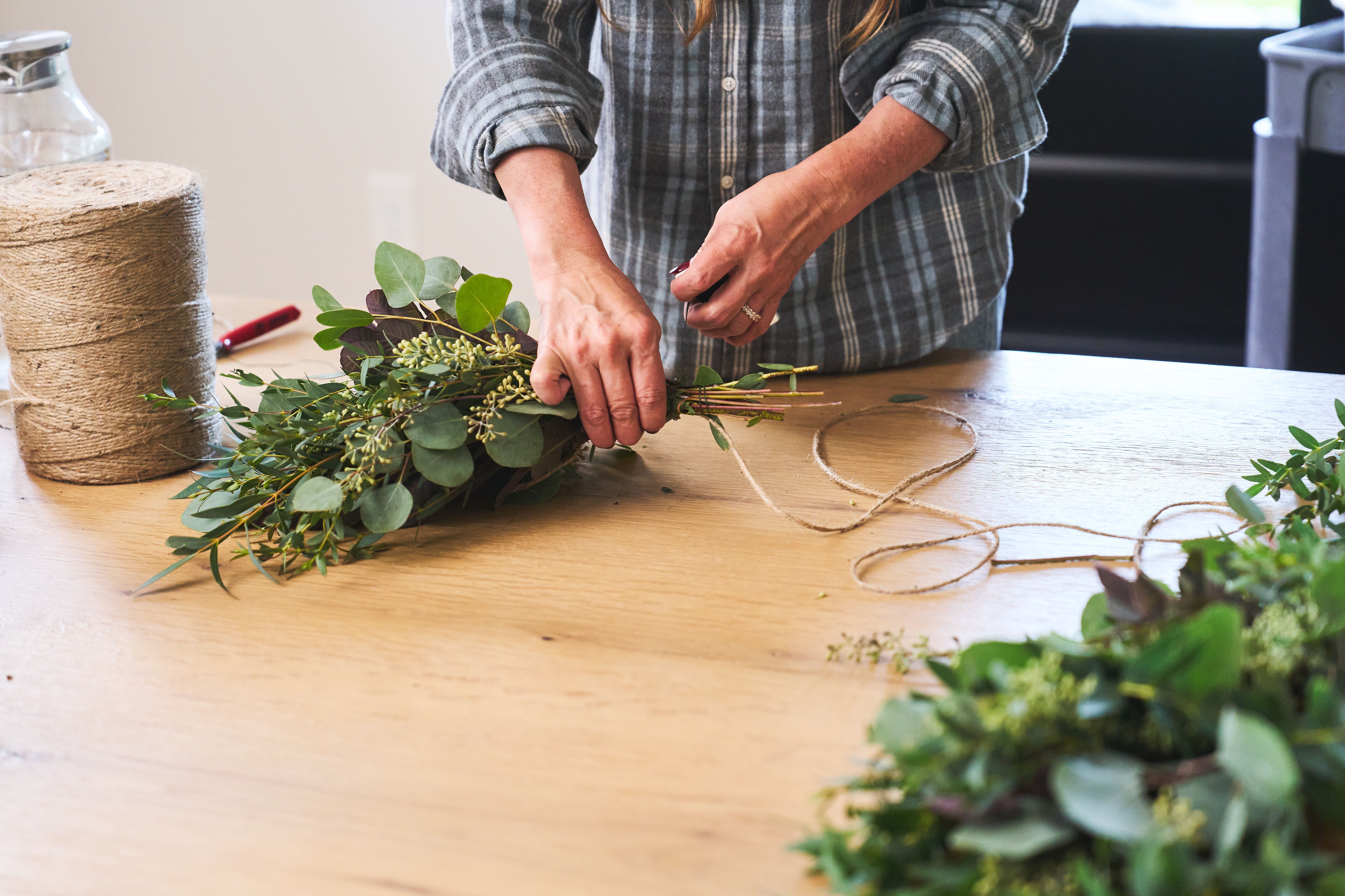 Once you have all your bunches of greens ready to go, you'll start placing each bunch either on your wreath frame or along your twine (for the Garland) next!