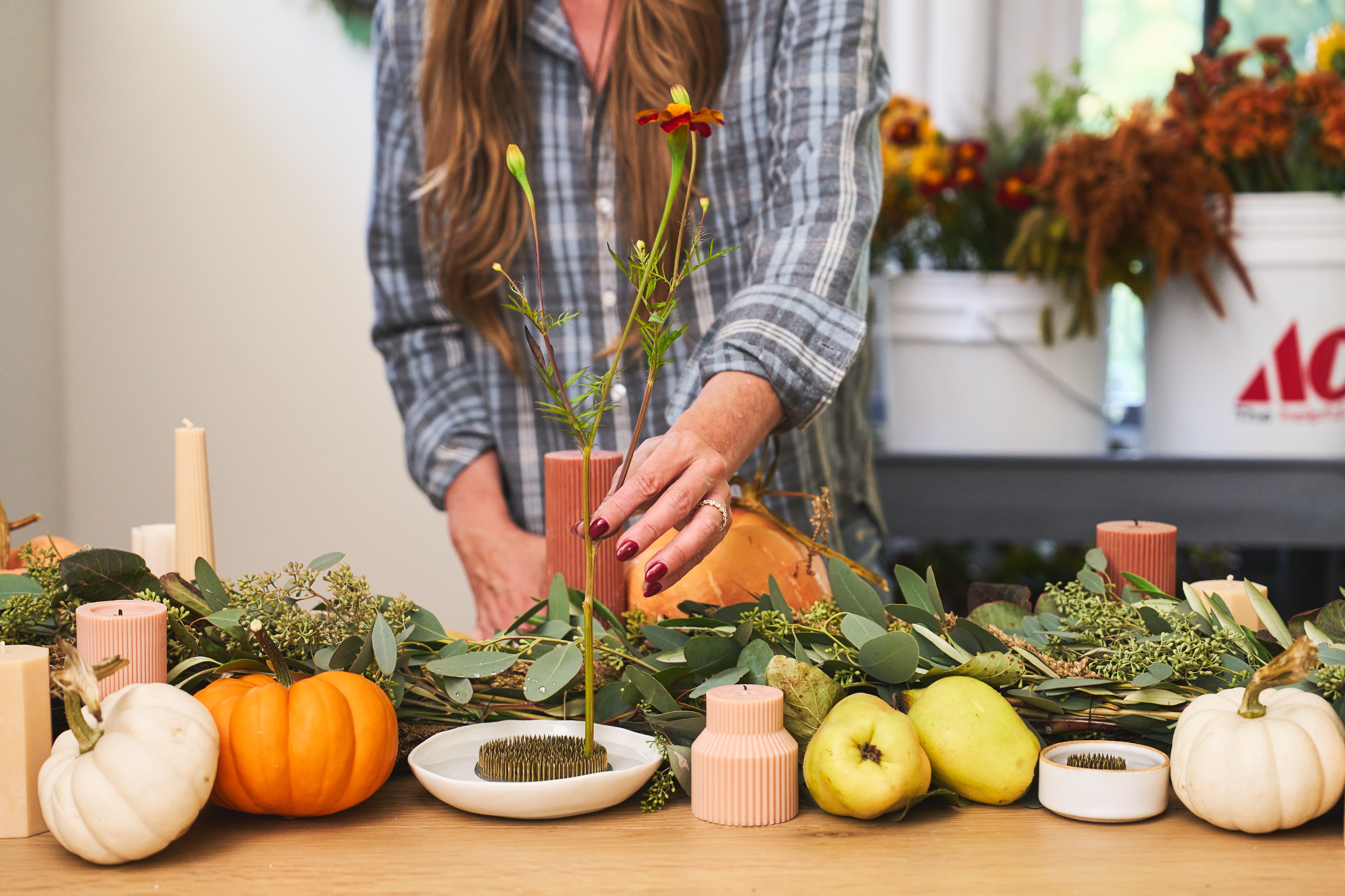 Flower frogs let a few stems stand like a stunning centerpiece. Place a few frogged arrangements on your table, pair them with your fresh foliage garland & seasonal accents for a beautiful, budget-friendly tablescape.