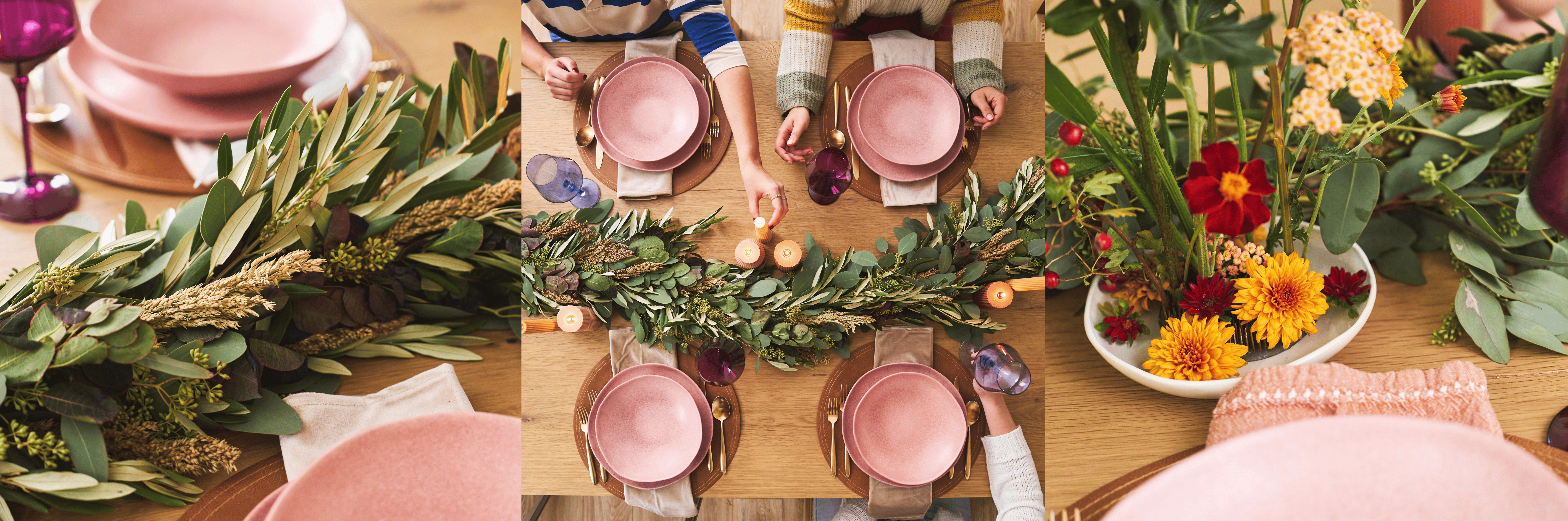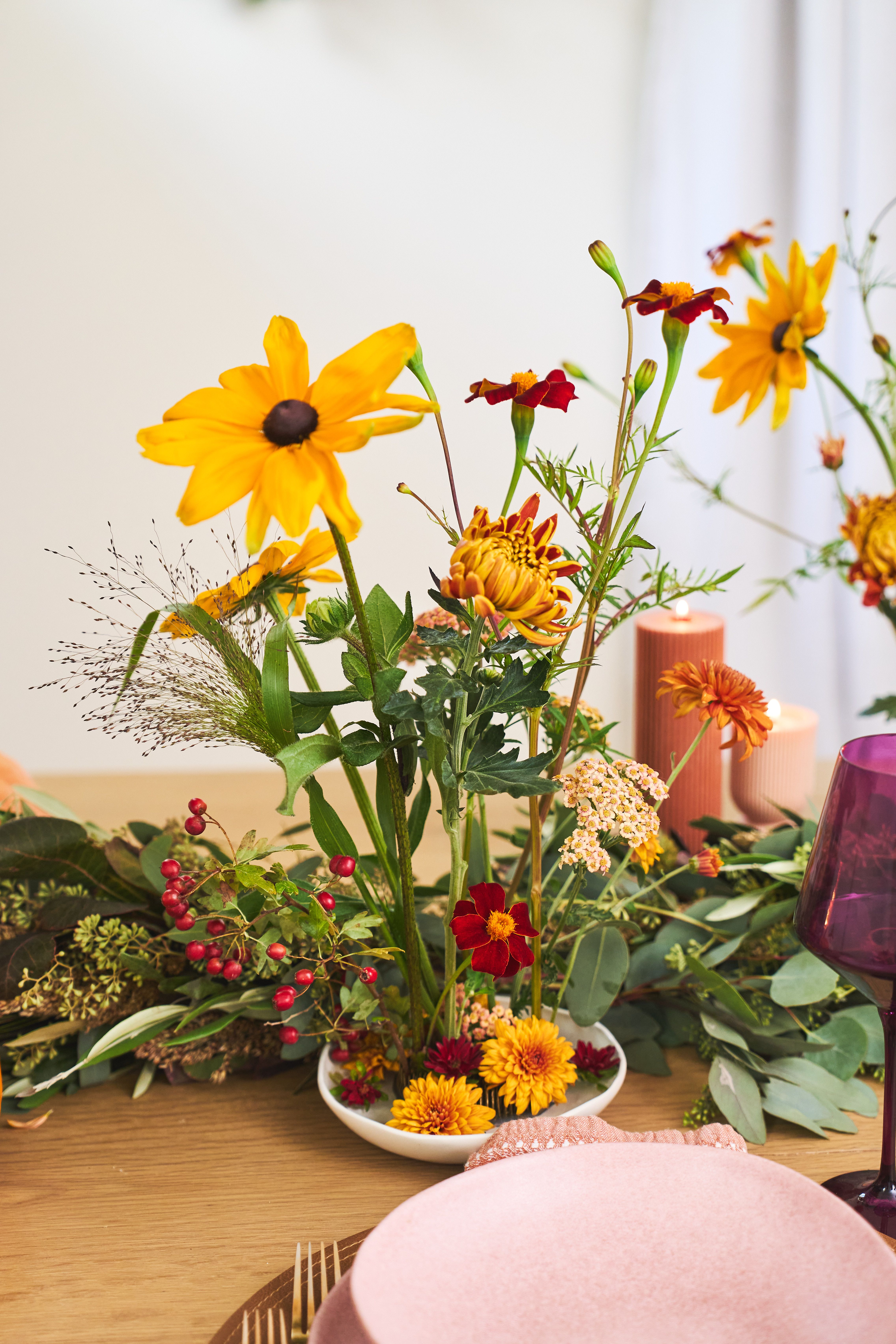 They’re the secret to turning just a few flowers into a showstopper of a centerpiece. Honestly, they might be the most fun we’ve had with flowers all year. And paired with a fresh garland, they create a Thanksgiving (or really any holiday or feast-like occassion) tablescape that feels warm, elegant, and budget-friendly.