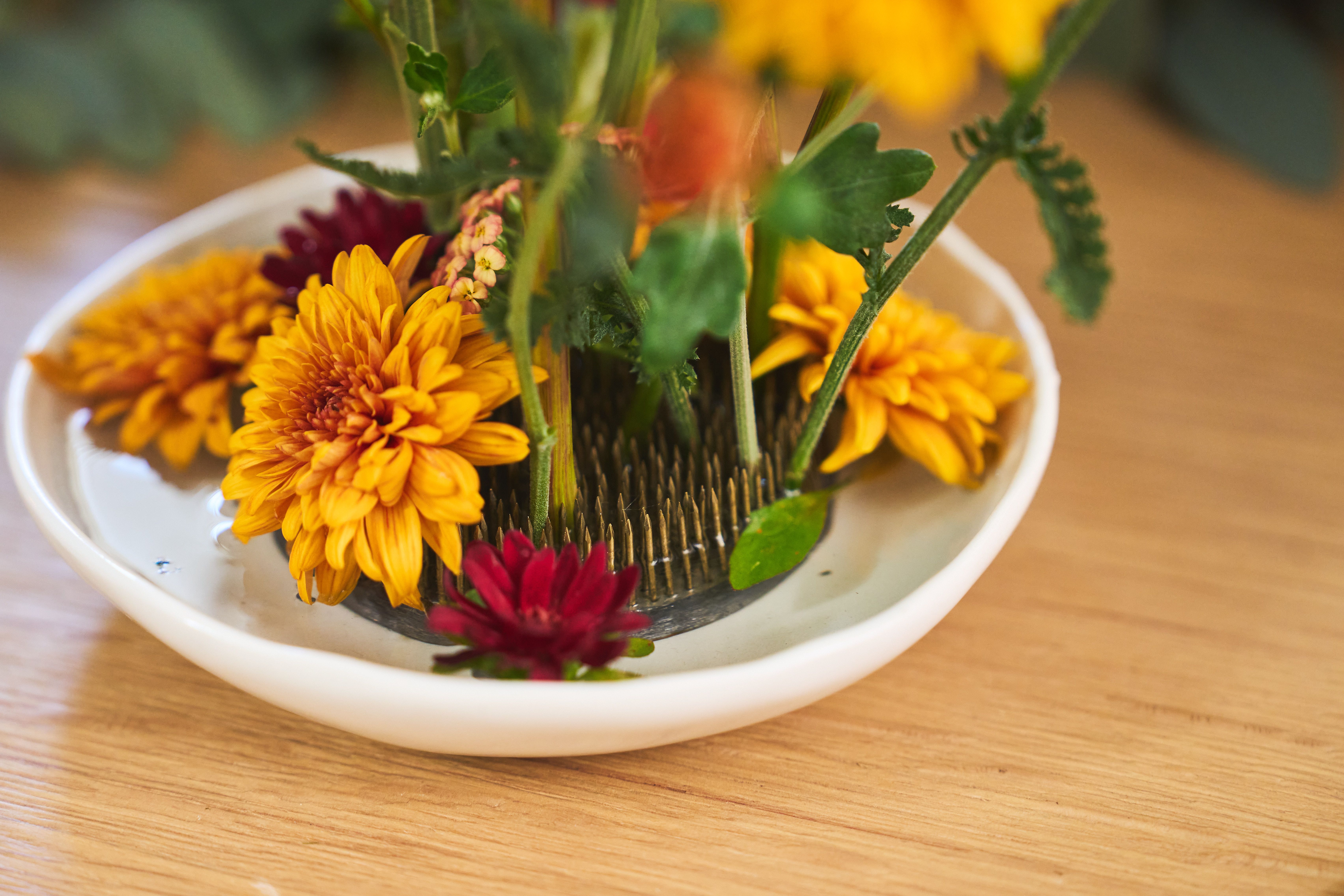 Cut each stem straight across and at varying lengths, then place the flowers onto the frog.