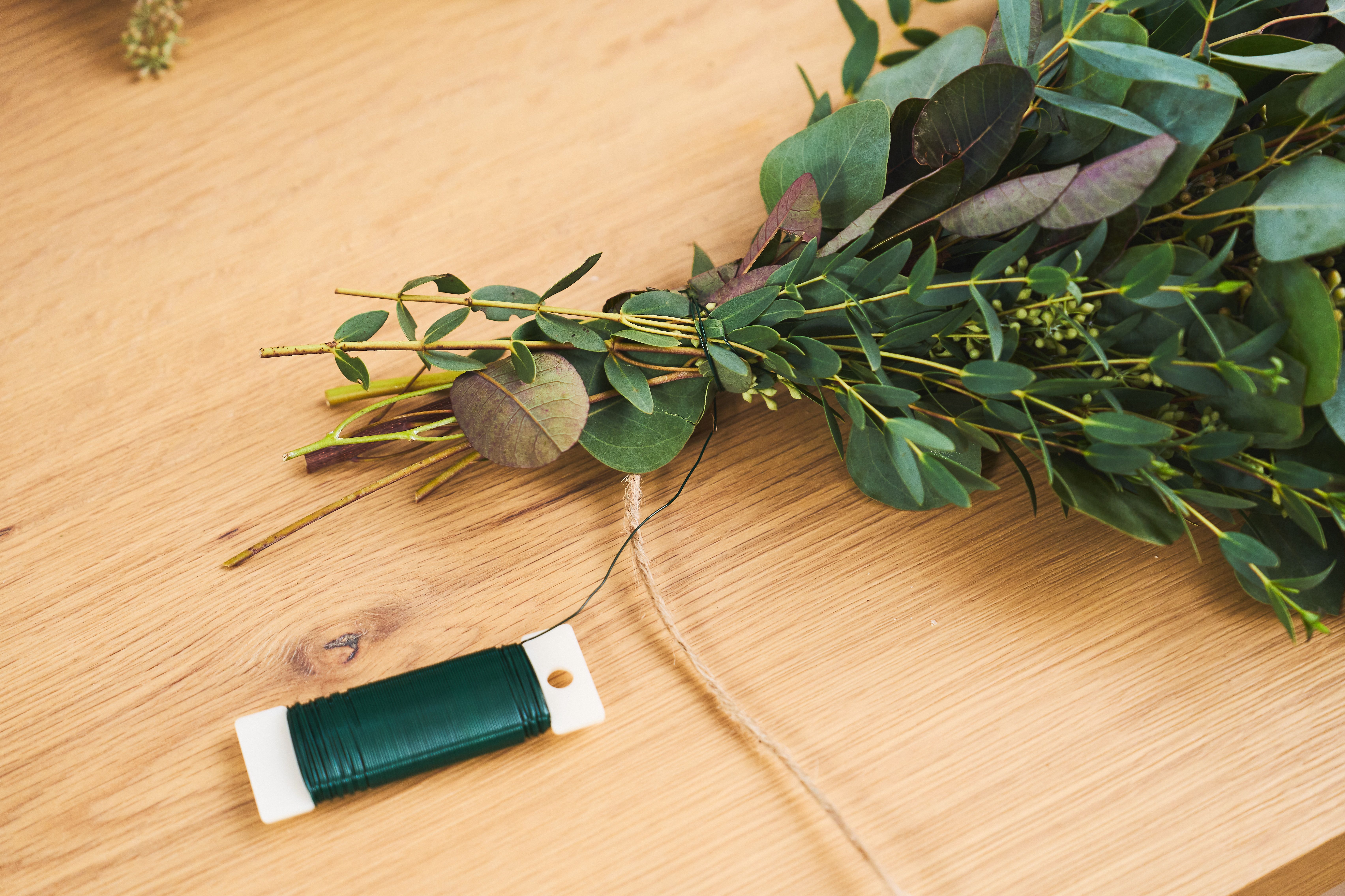 Step 2: Twist & wrap your paddle wire around the base of each bundle to secure it to your wreath frame or twine.