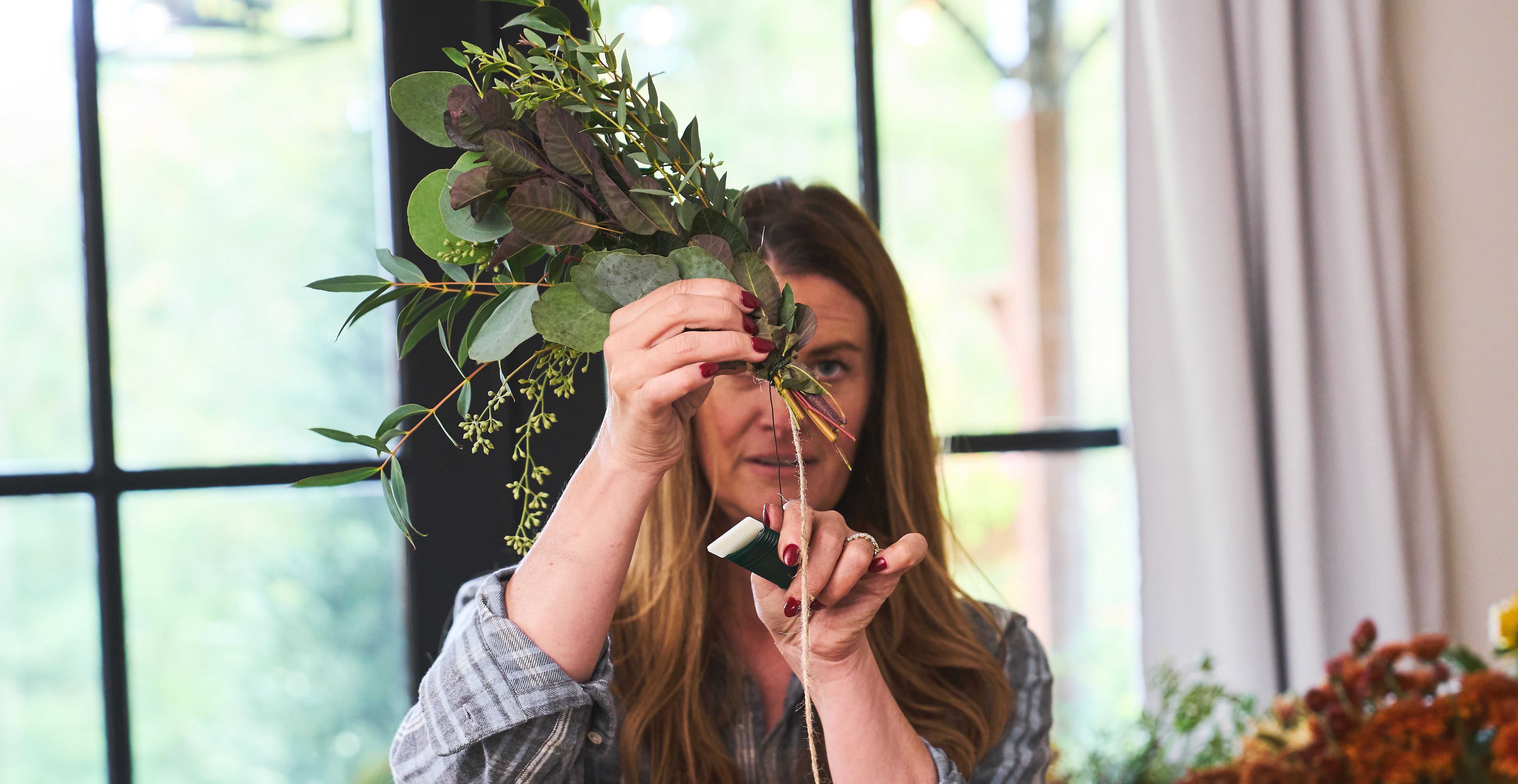 Step 1: Gather your foliage into small bunches of 5–7 stems, staggering and fanning them so the textures play together nicely. Tie with paddle wire and cut it.